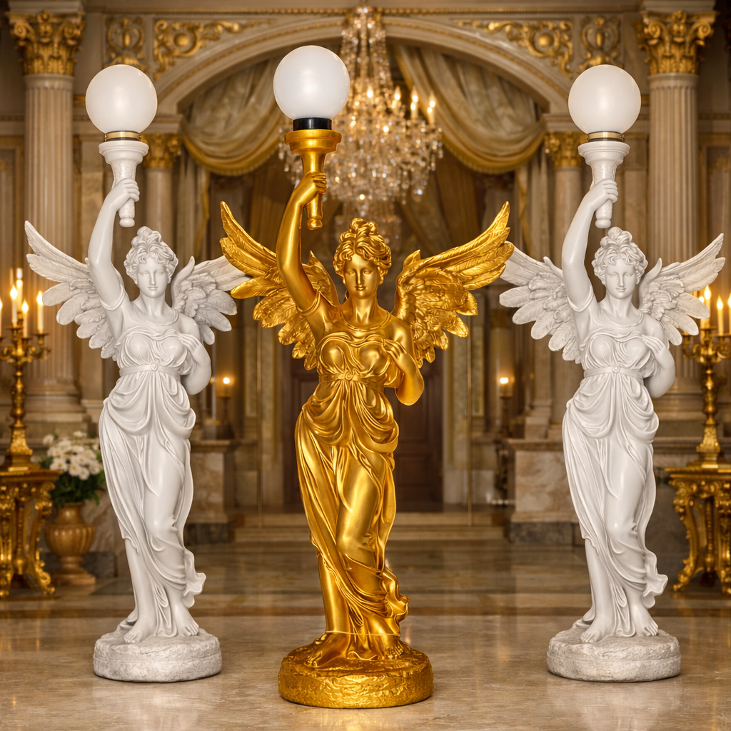 LOTUS Heykel İmalatı tarafından üretilen 1.90 m Melek Heykeli Lambader, mekanlara ihtişam ve estetik katmak için tasarlanmış özel bir dekoratif üründür.