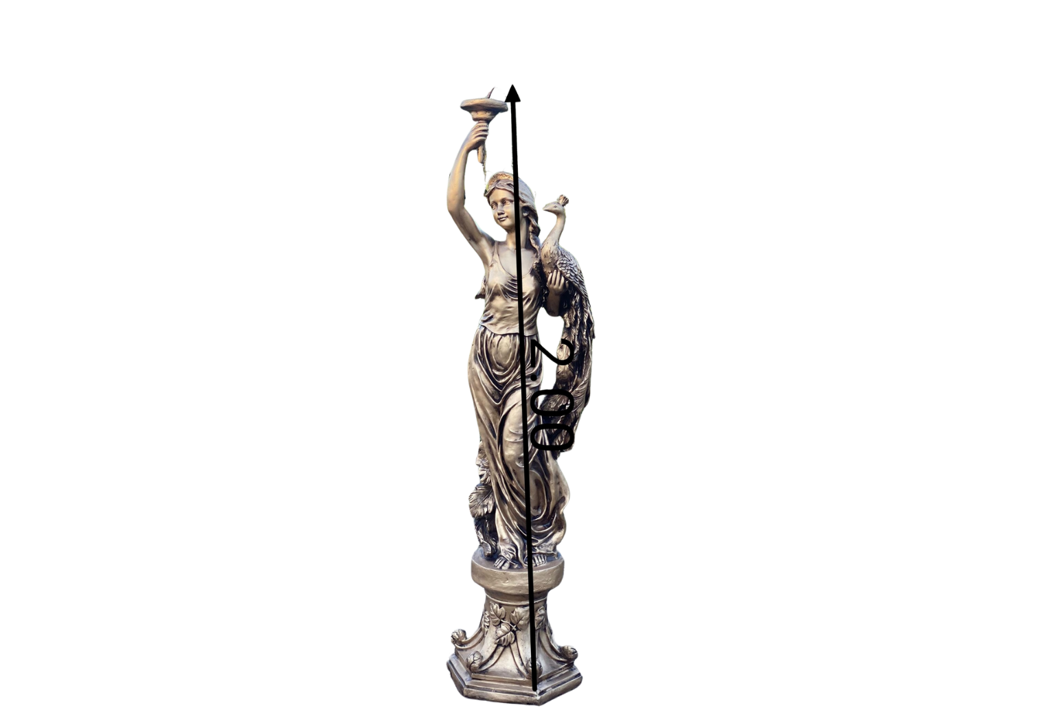 Bu zarif fiberglas antik tanrıça heykeli, sanatı ve mitolojiyi buluşturan estetik bir eserdir. Elinde tuttuğu lambayla ışık saçan figür, klasik heykel detaylarına sahip olup bulunduğu mekana zarafet ve tarihsel bir atmosfer katar. Heykelin yüksekliği 1.90 metre olup, antik Yunan ve Roma dönemi tanrıça figürlerinden esinlenerek üretilmiştir. Yanında duran tavus kuşu detayı, görkemli bir görüntü sağlarken figürün ihtişamını pekiştirir.