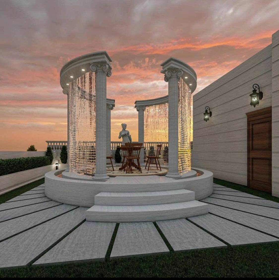 Lüks Sütunlu Açık Hava Oturma Alanı, modern şıklığı ve klasik mimarinin zarafetini birleştiren eşsiz bir tasarımdır. Yuvarlak platform üzerinde zarif sütunlarla desteklenen bu yapı, dekoratif ışıklandırmalar ve parıltılı detaylarla donatılmıştır. Merkezde bulunan heykel ve oturma alanı, açık hava etkinlikleri, özel davetler veya günlük kullanım için mükemmel bir ortam sağlar.